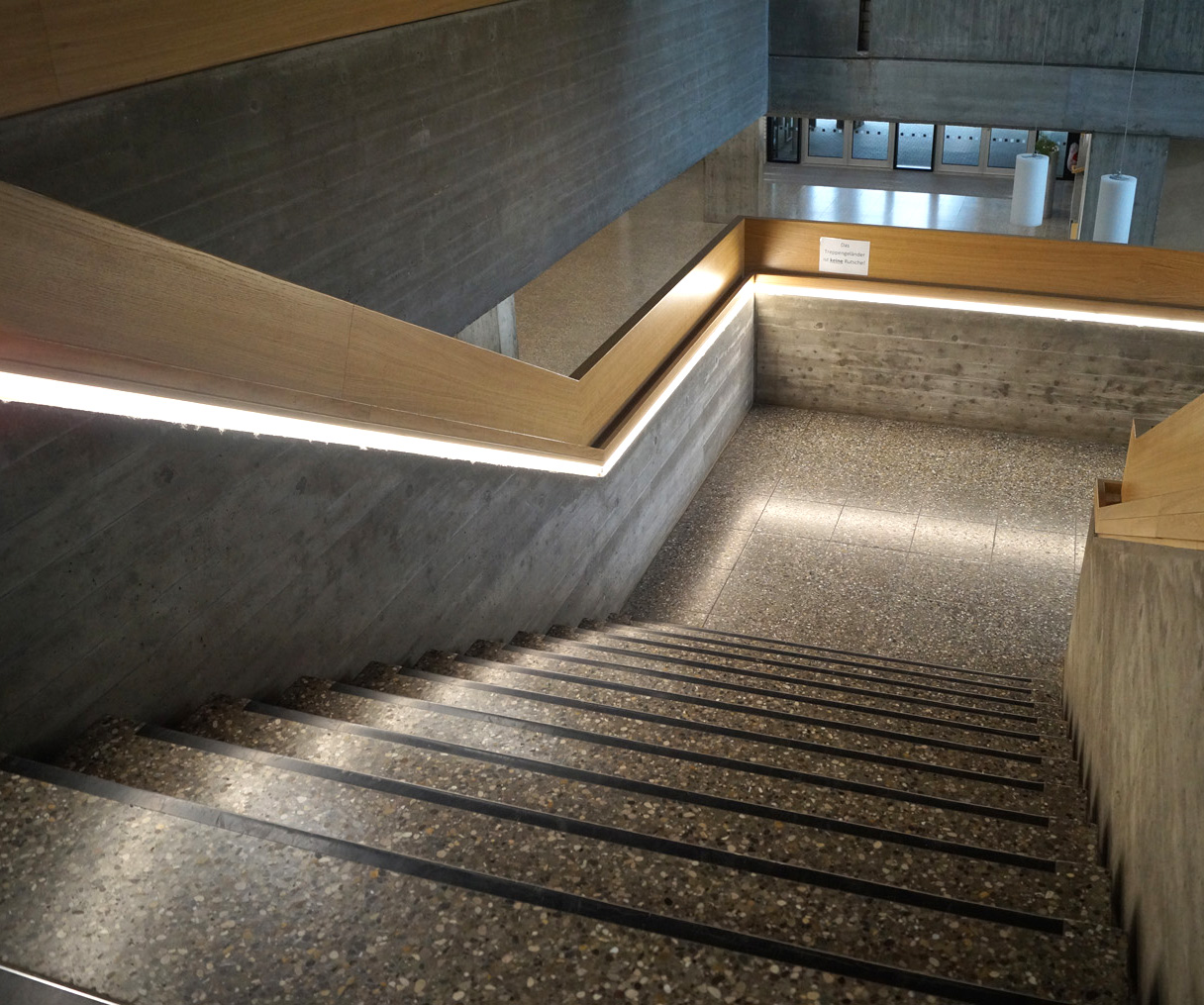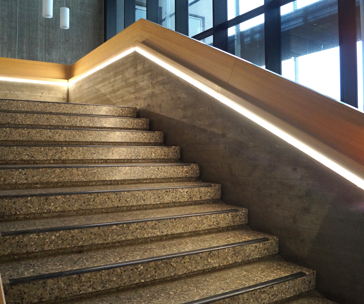 Treppenhausbeleuchtung über linear im Handlauf eingebettete Lichtkanäle, mit individuell angepassten horizontalen und vertikalen Gehrungsschnitten.