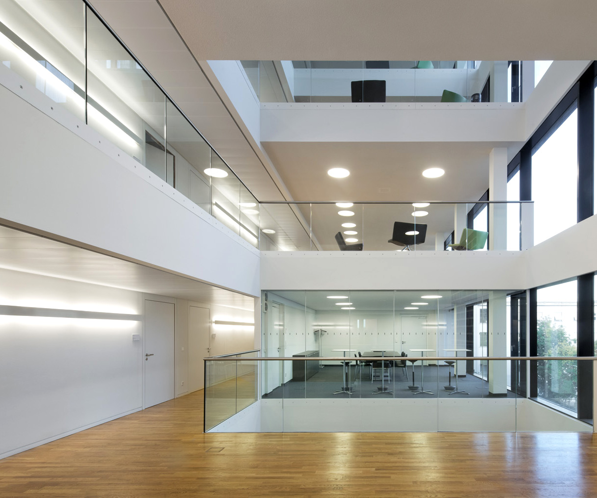 Beleuchtung der Flurzonen mit indirekten Wandlichtkanälen. In den Abgeordnetenbüros sorgen besonders flache direkt und indirekt strahlende Pendelleuchten für normgerechte Arbeitsplatzbeleuchtung. Das Foyer und die Eingangshalle wurden mit runden in sich leuchtenden Pendelleuchten ausgestattet.