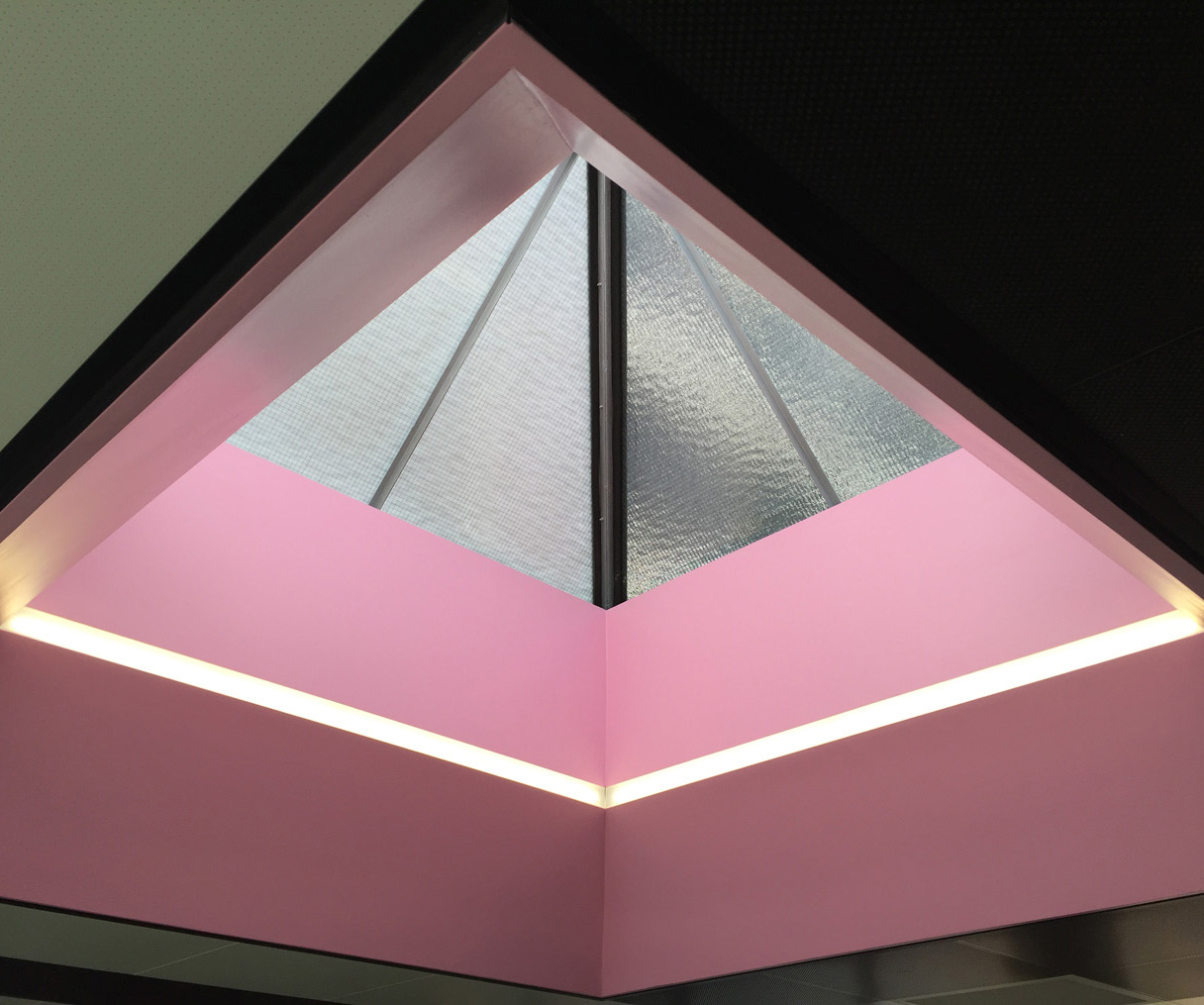 Die architektonisch ansprechende Decke mit den dominanten Oberlichtern wurde vom Architekturbüro ZieglerBürg neu gestaltet. LED Profilleuchten führen das Tageslicht nach und betonen die Konstruktion.