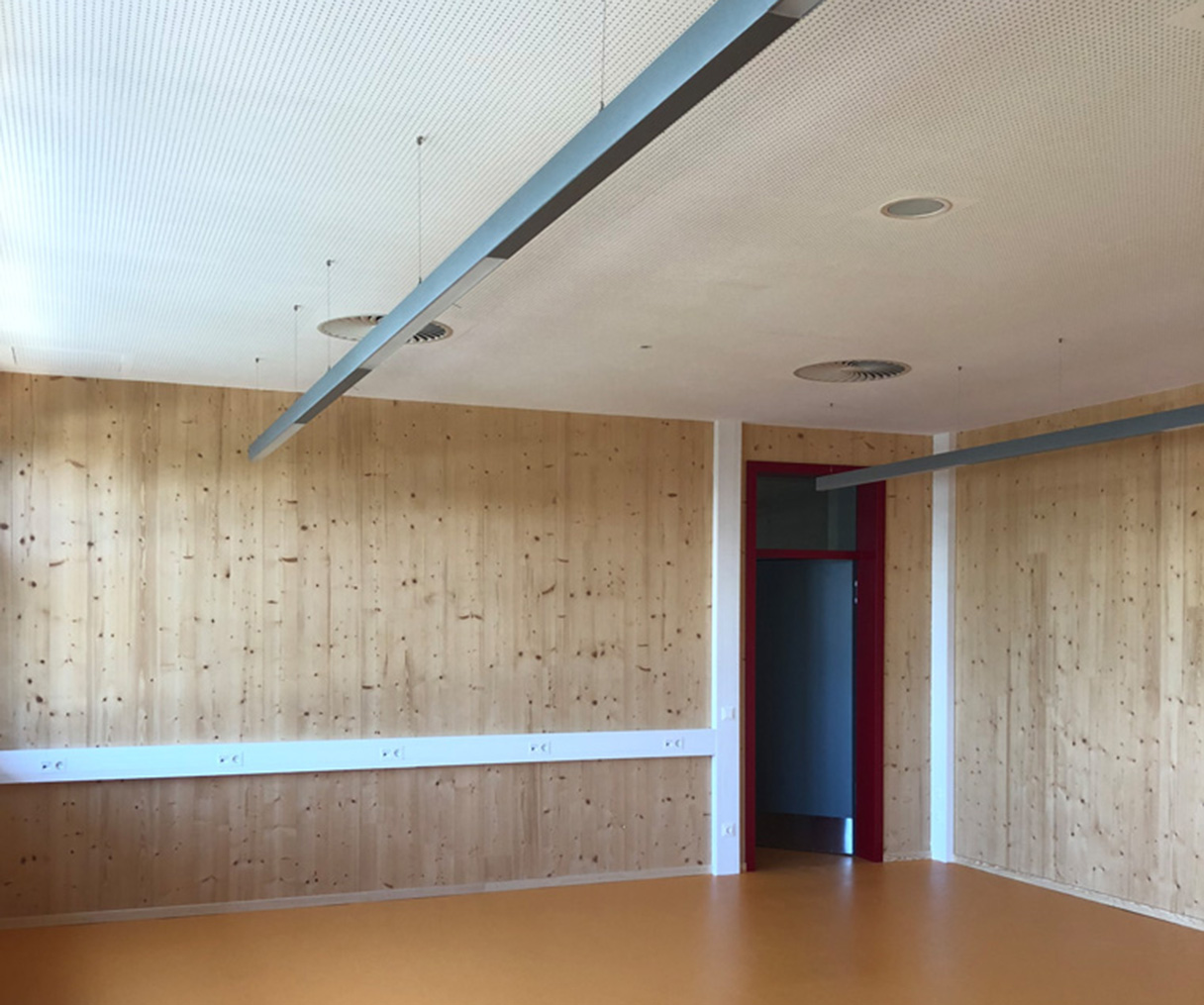 Im an die Schule angrenzenden Ergänzungsbau, sorgen direkt und indirekt strahlende Pendelleuchten in den Klassenzimmern, und unterschiedlich große Rundleuchten in den Treppenhäuser und Fluren sowie der Mensa für angenehme Lichtverhältnisse. E-Planung: Ingenieurbüro Kurz und Fischer