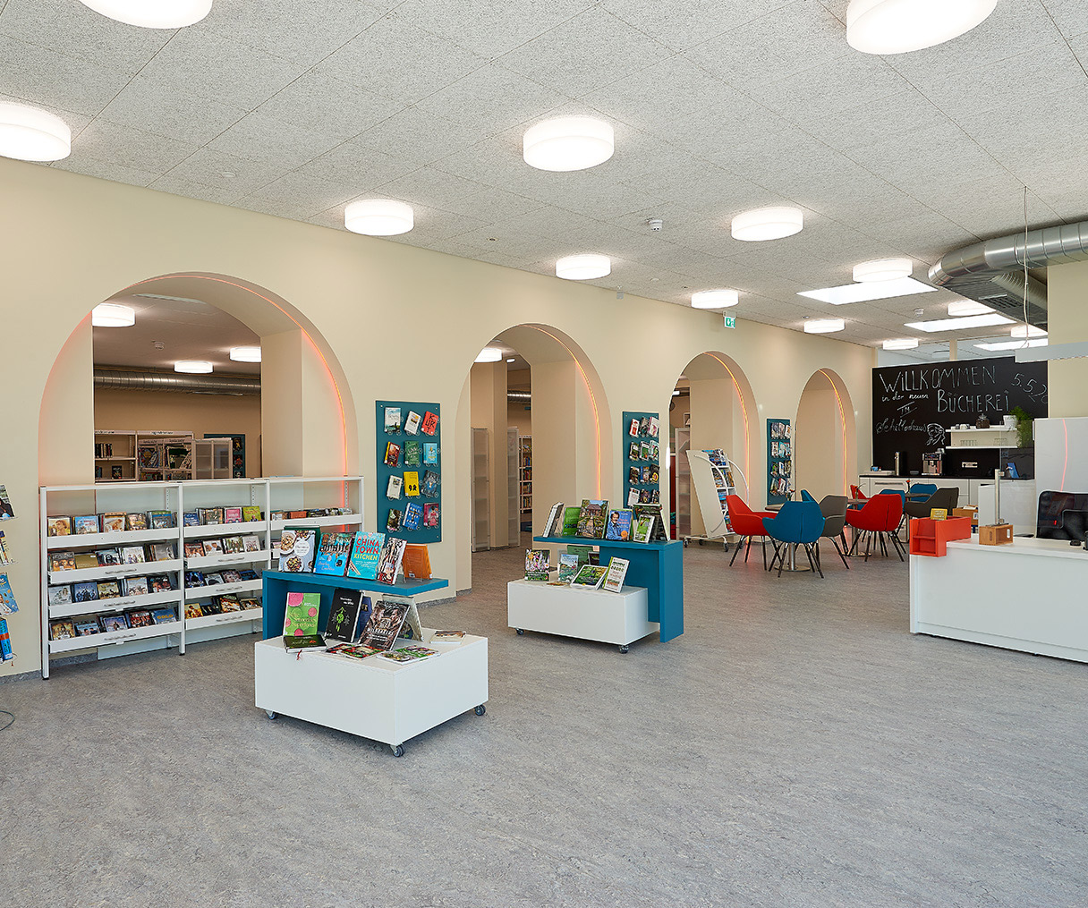 Die Allgemeinbeleuchtung der Klassen, Flure und der Bibliothek wurden mit Tulux Spin Anbau – und Pendelleuchten realisiert. Im historischen Treppenhaus beleuchtet das additive System LEAN blendungsbegrenzt und dennoch mit hohen Beleuchtungsstärken.