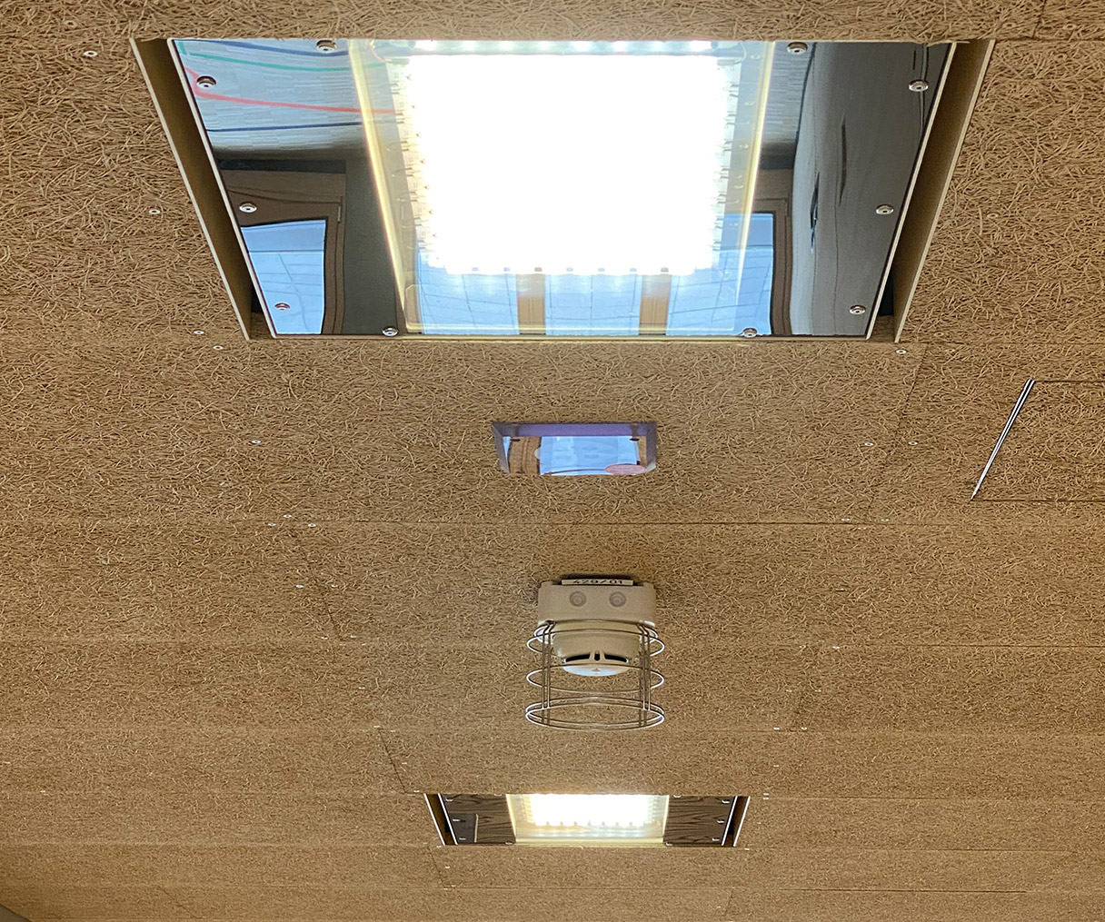 Klassische und ballwurfzertifizierte Hochleistungsscheinwerfer beleuchten die zwei Sporthallen. Durch spezielle Linsentechnik werden besonders hohe vertikale Beleuchtungsstärken erzielt die schnelle Bewegungsabläufe besser erkennen lassen. LED Profilleuchten beleuchten die Umgänge.