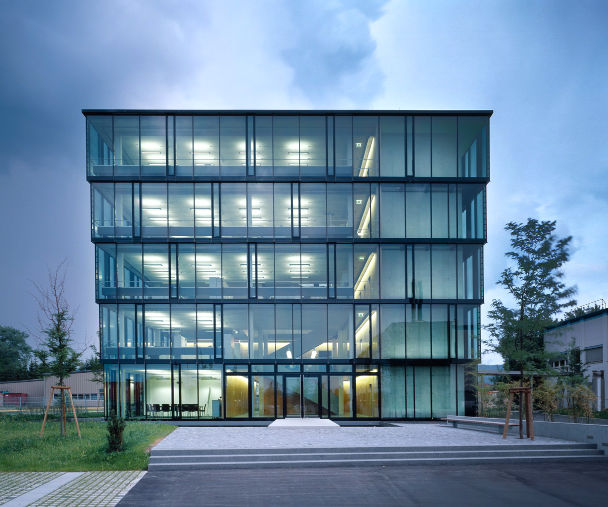 Flache Pendelleuchten als Arbeitsplatzbeleuchtung und objektbezogene Lichtbänder mit Louverrastern für die Wandelemente