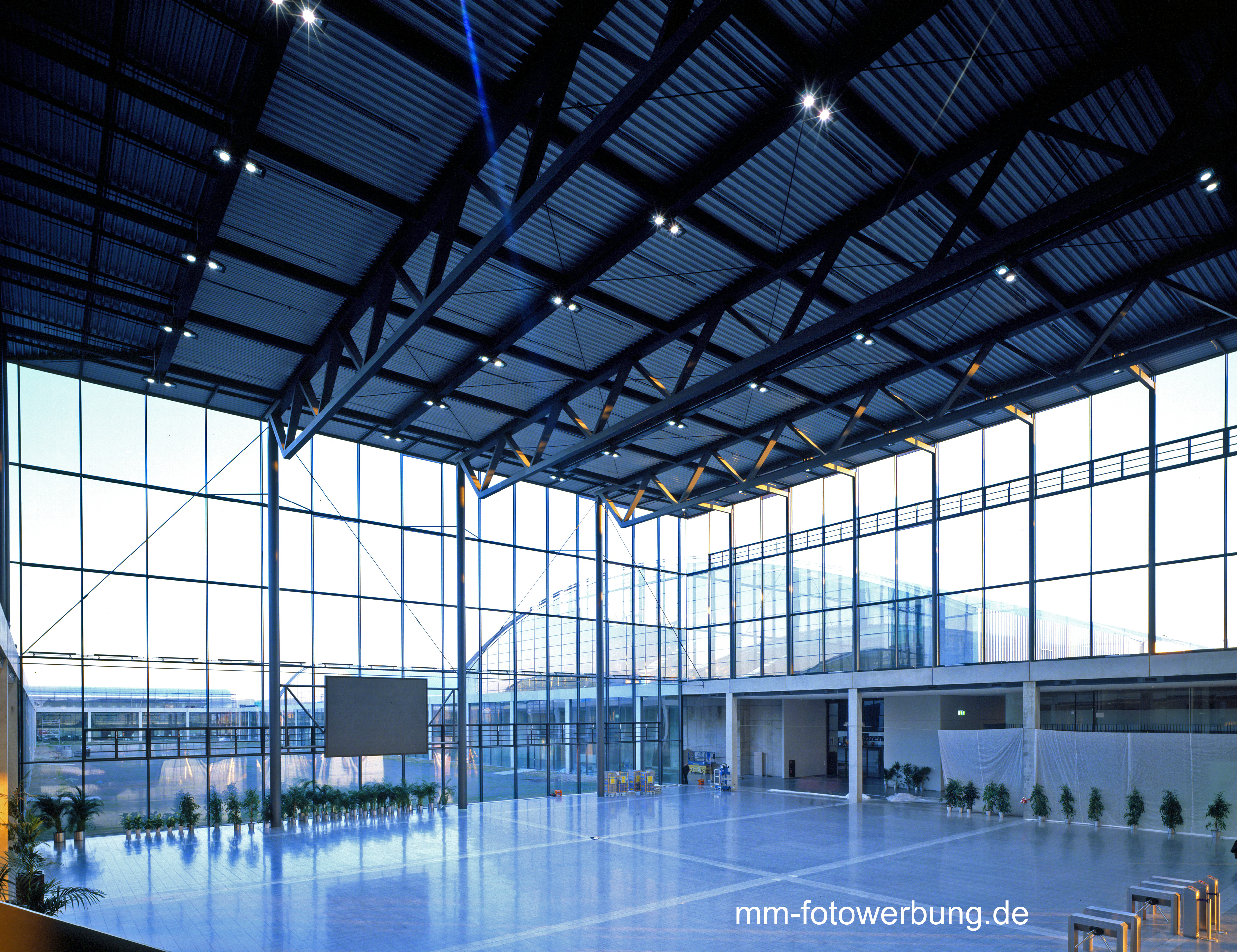 Planflächenstrahler der Franz Sill GmbH in verschiedenen Leistungsstufen beleuchten die Parkplätze, die Zufahrtswege, das große Vordach des Eingangsgebäudes und die Aktionhalle. In den Planflächenstrahlern der Aktionshalle kommen dimmbare Halogen-Glühlampen, wie auch leistungsstarke Halogen-Metalldampflampen zugleich zum Einsatz.