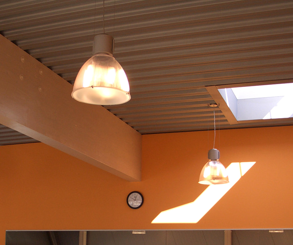 Technische Pendlleuchten mit brillanten Halogen-Metalldampflampen sind in der großen Halle im Einsatz