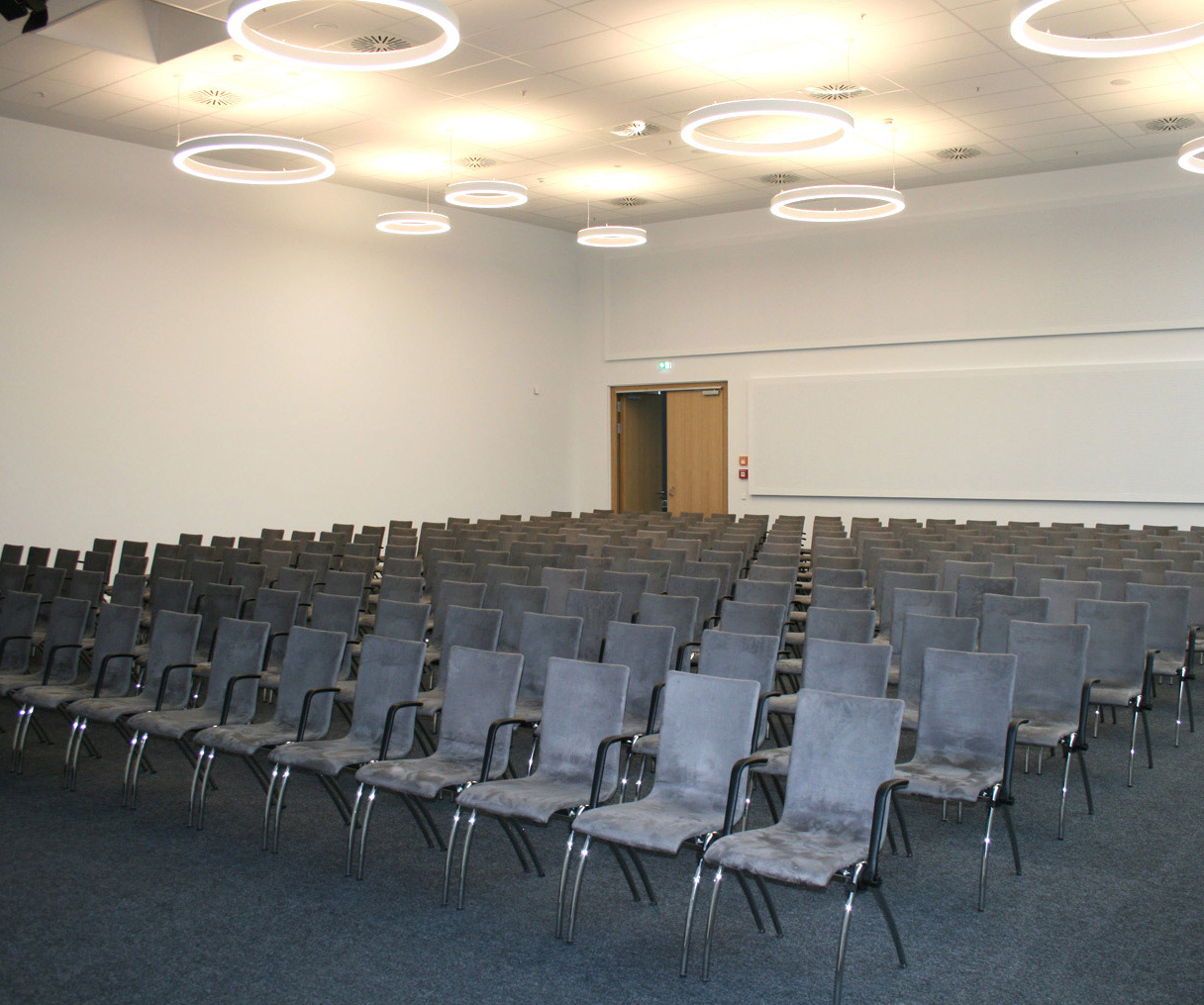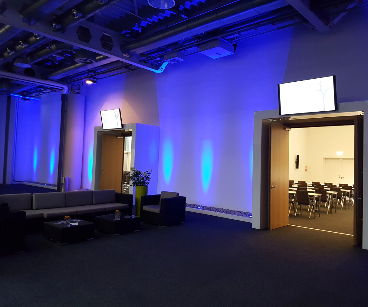 Die Eventlocation am Zoo Karlsruhe bietet direkten Zugang ins Grüne. Aus akustischen und brandschutztechnischen Gründen wurden LED Ringleuchten eingesetzt. Ingenieurbüro: Bender und Urich, Karlsruhe