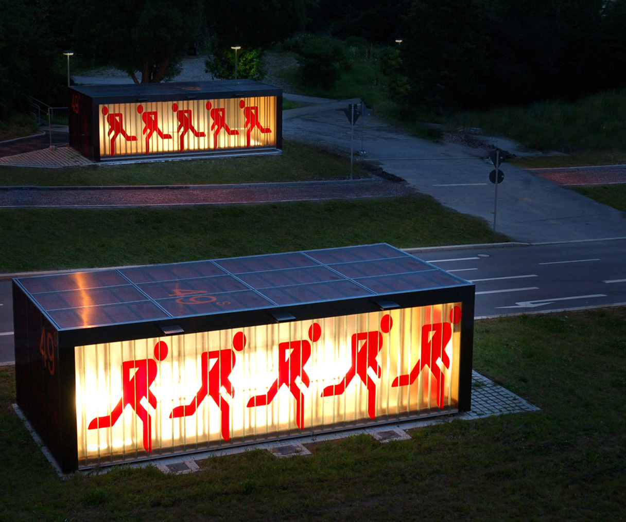 Akzentuierte Beleuchtung der roten Betonbalken mit eingelassenen Lichtkanälen und technische Beleuchtung der Ein- und Ausfahrten des Tunnels.