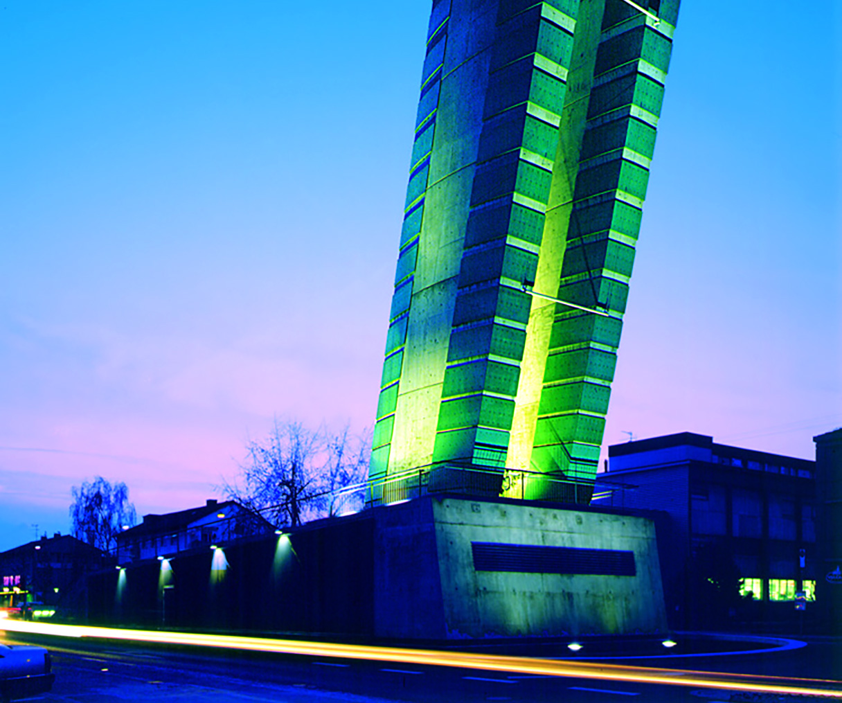 Die Tunnelportale und Zufahrten sind beidseitig mit Sill Kompaktstrahlern der Serie 408 beleuchtet. Das Lüftungsbauwerk ist mit Spangen aus Slimline Leuchtröhren verziert.