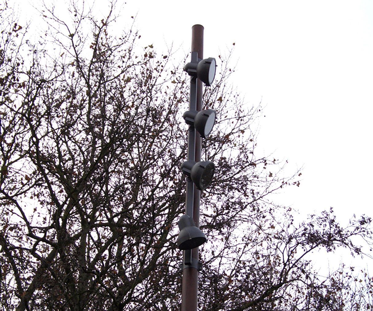 Dekorative Holzmaste von Aubrilam mit Sill Projektorscheinwerfern, zur Beleuchtung der Fahr - und Laufwege. An der Unterseite der Brücke Sill Hochleistungsscheinwerfer für die Effektbeleuchtung.