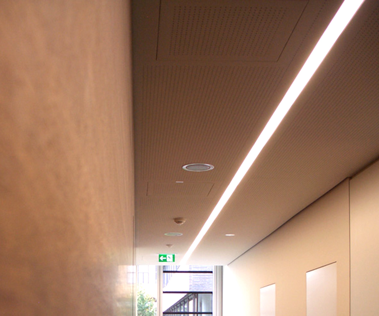 Einbau-Lichtkanäle in vertikale und horizontaler Gehrung in den Verkehrszonen. Klassenzimmerbeleuchtung mit Parabolkastenleuchte als Band in minimaler Bauform.