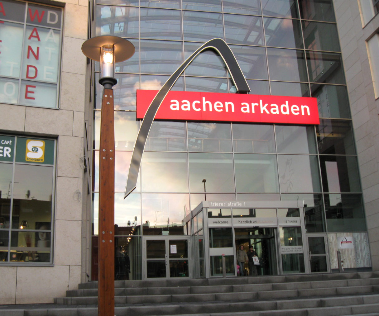 Elegante Holzmasten der Firma Aubrilam mit Schrèder Leuchten beleuchten die Vorbereiche des Einkaufszentrum "Aachen Arkaden". Die besonders CO-sparende Produktion der Holzmasten bedarf der Beachtung!