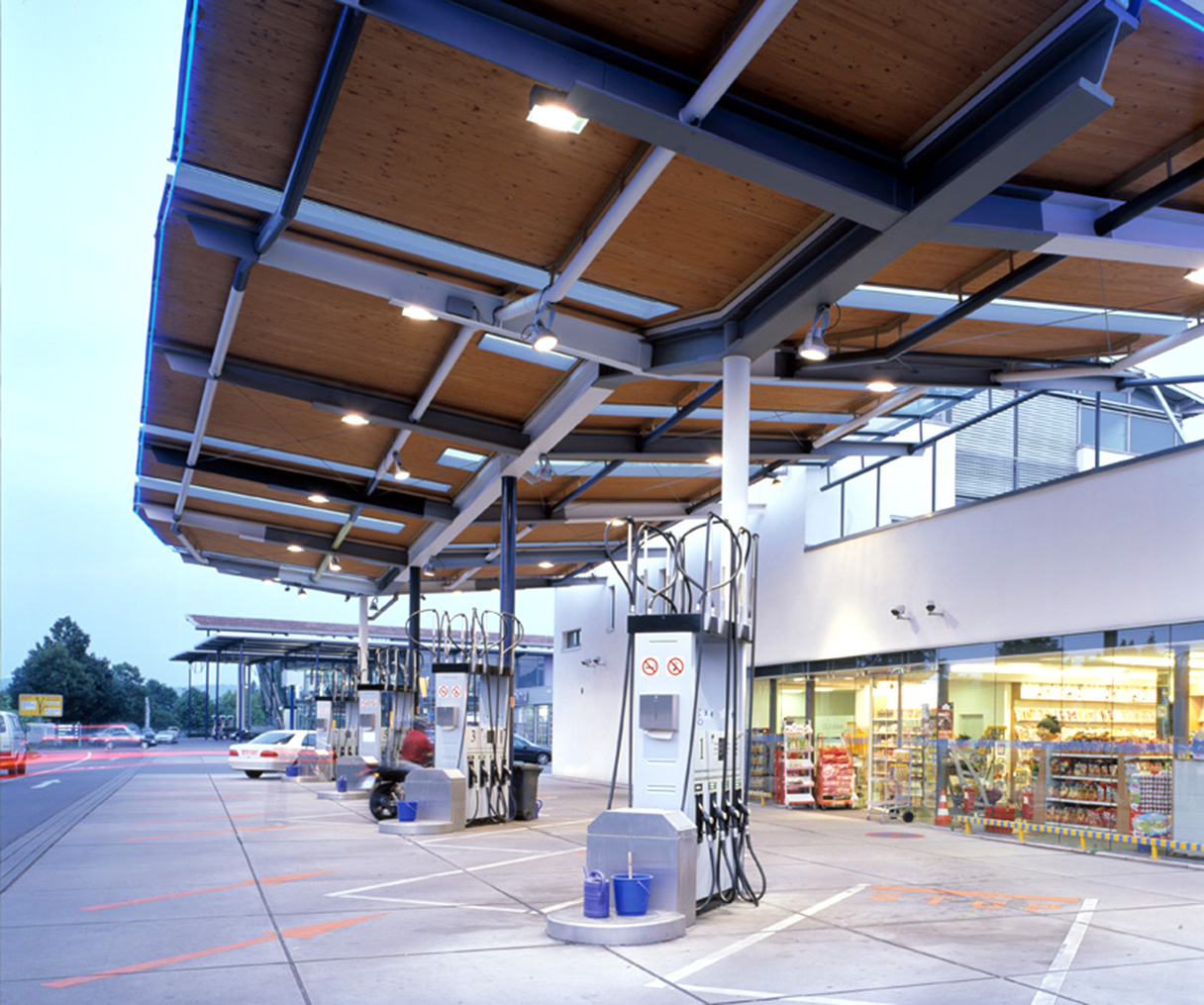 Tankstellenbleuchtung mit Sill - Kompaktstrahler der Serie 408 + Stellflächenbeleuchtung mit Sill - Planstrahler der Serie 455. Gebäudekanten mit Sill Planstrahlern Serie 453