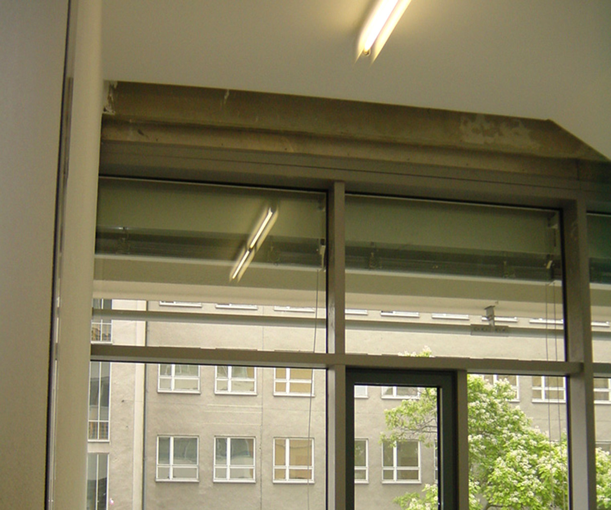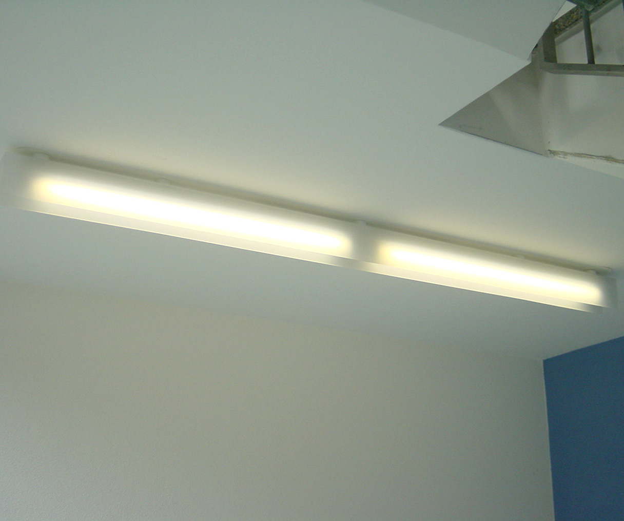 Beleuchtung von Treppenhäusern mit einer Objektleuchte aus kantigen Acrylprofilen in Kombination Leuchtstoffeinheiten.