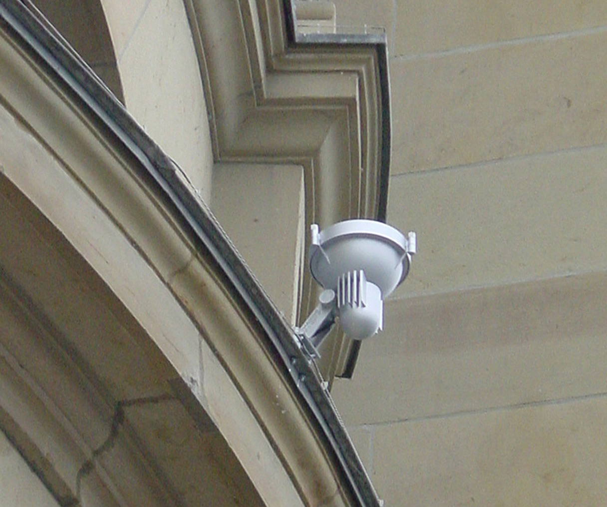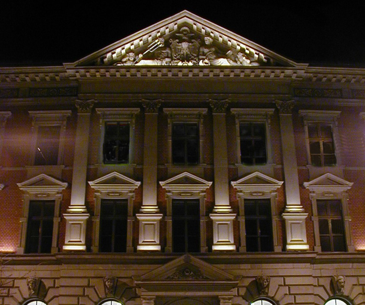 Das Fassade des historischen Gebäudes wir mit Sill Projektorscheinwerfern Typ 020 akzentuiert angestrahlt. Die kleine Bauform der Leuchten ermöglicht, dass die Leuchten in den Hintergrund treten.