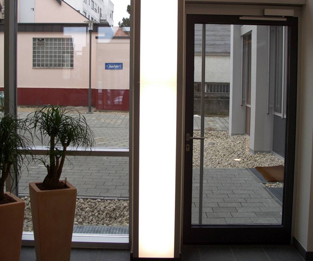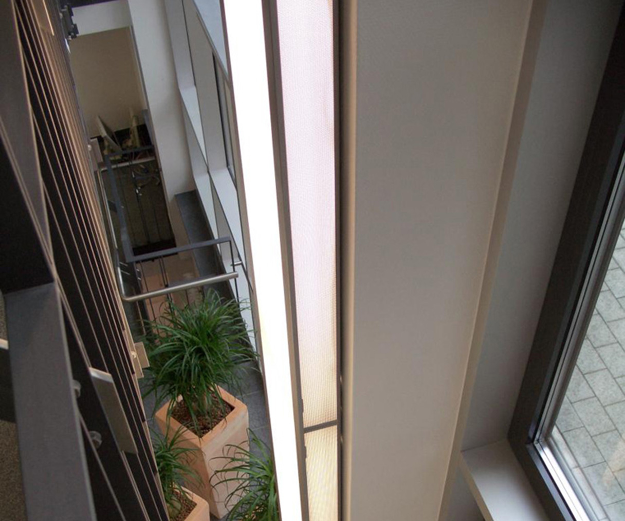 Im Treppenhaus und Foyer der Bank wird die Allgemeinbeleuchtung über einen breiten Lichtkanal in Sonderbauweise realisiert. Im Leuchtengehäuse verlaufen zwei parallel angeordnete T5 Leuchtstofflampenstränge hinter VSG Scheiben mit Diffusorfolie.