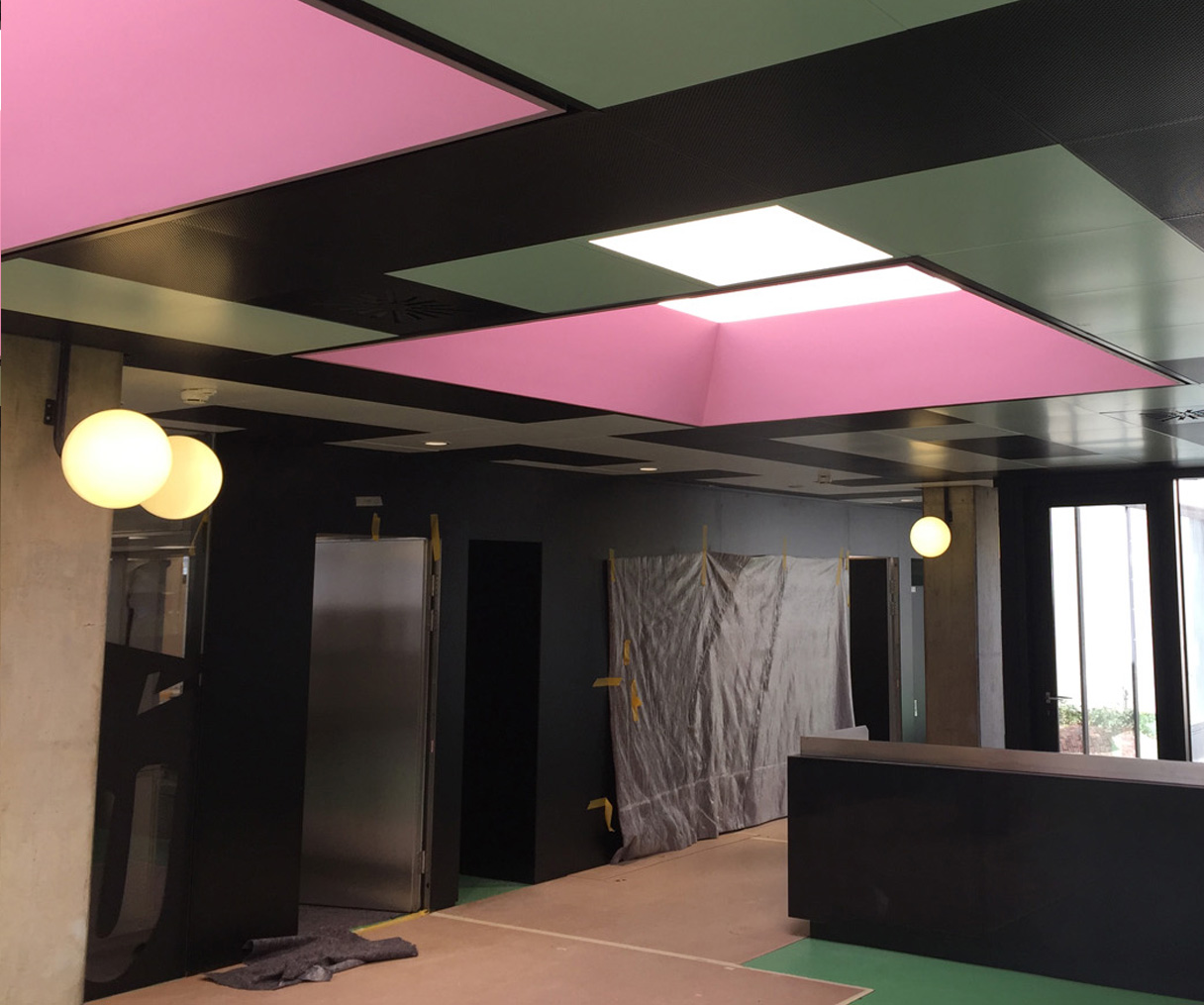Die architektonisch ansprechende Decke mit den dominanten Oberlichtern wurde vom Architekturbüro ZieglerBürg neu gestaltet. LED Profilleuchten führen das Tageslicht nach und betonen die Konstruktion.