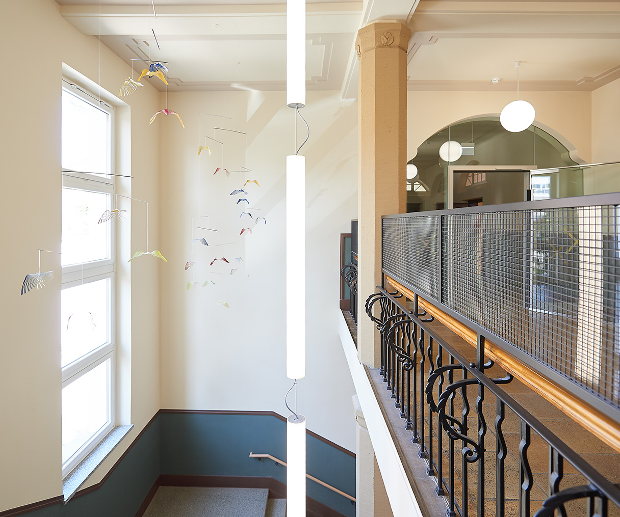 Die Allgemeinbeleuchtung der Klassen, Flure und der Bibliothek wurden mit Tulux Spin Anbau – und Pendelleuchten realisiert. Im historischen Treppenhaus beleuchtet das additive System LEAN blendungsbegrenzt und dennoch mit hohen Beleuchtungsstärken.
