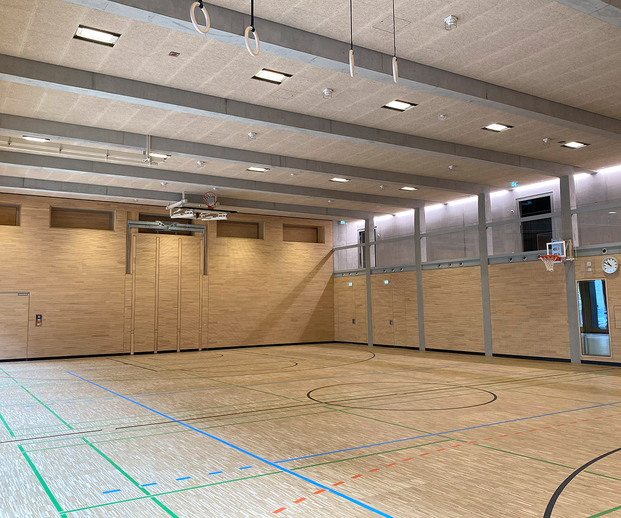 Klassische und ballwurfzertifizierte Hochleistungsscheinwerfer beleuchten die zwei Sporthallen. Durch spezielle Linsentechnik werden besonders hohe vertikale Beleuchtungsstärken erzielt die schnelle Bewegungsabläufe besser erkennen lassen. LED Profilleuchten beleuchten die Umgänge.