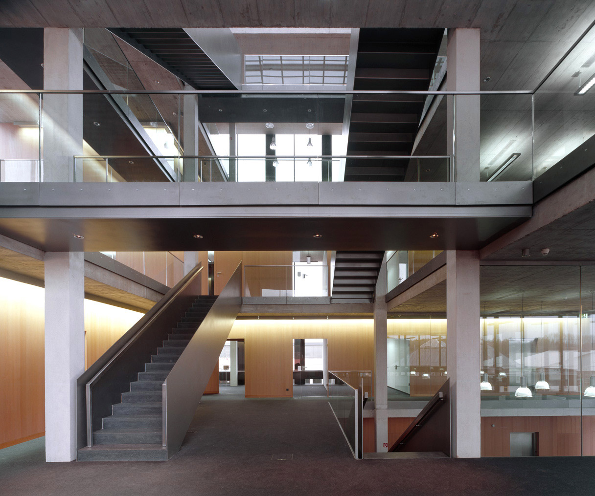 Flache Pendelleuchten als Arbeitsplatzbeleuchtung und objektbezogene Lichtbänder mit Louverrastern für die Wandelemente