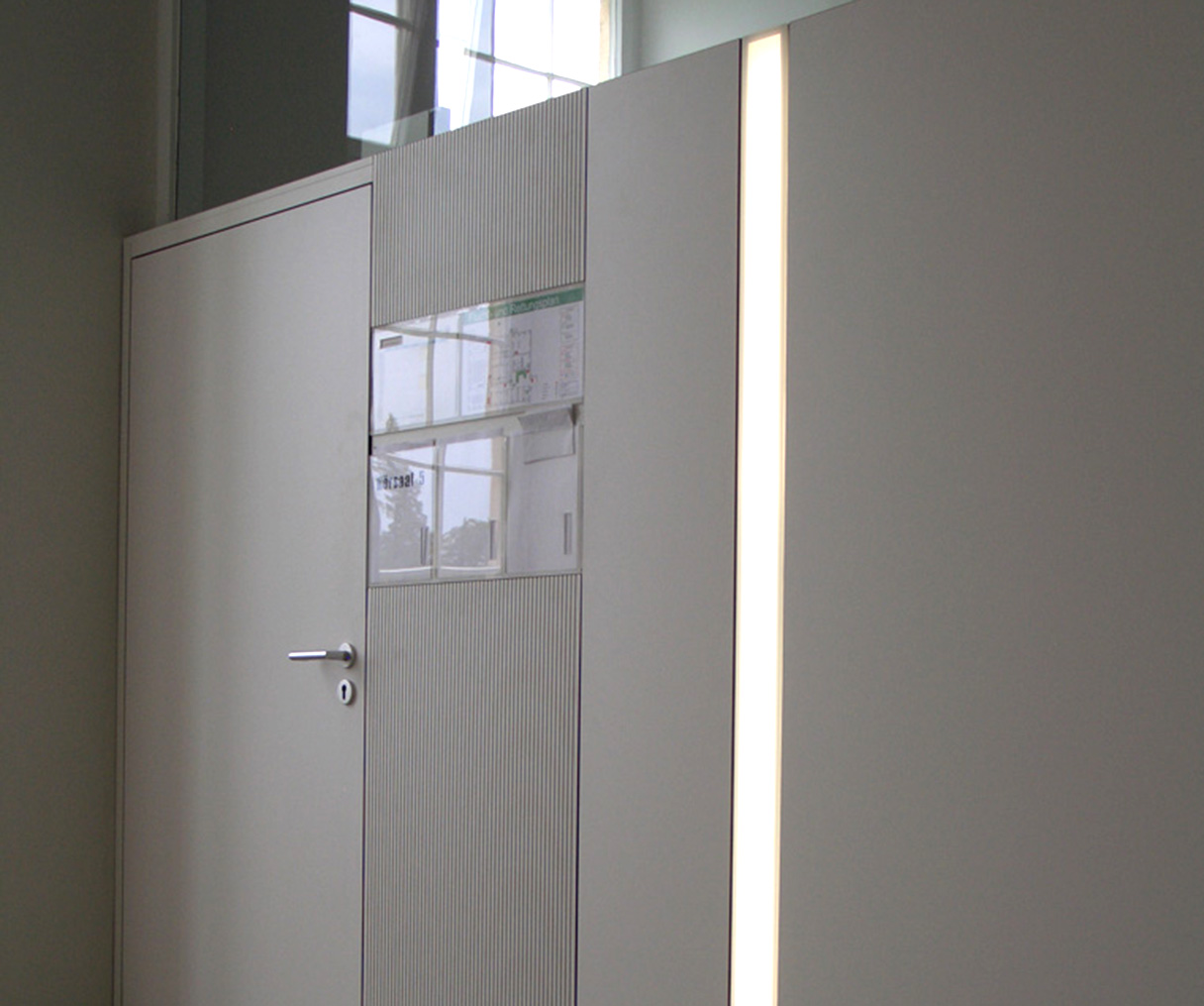 Sanierung und Umbau der Hörsäle, sowie der Flurzonen. Rahmenlose Lichtkanäle für T5 Leuchtstofflampen in die GK-Decken eingesetzt. Mit dem gleichen Profil ist die Tafelbeleuchtung realisiert, jedoch mit asymmetrischer Lichttechnik. Im Flur sind vertikale Lichtkanäle einsetzt, die mit Siebbedruckten VSG Scheiben versehen sind. Die Scheiben schließen bündig mit der Holzverkleidung ab.