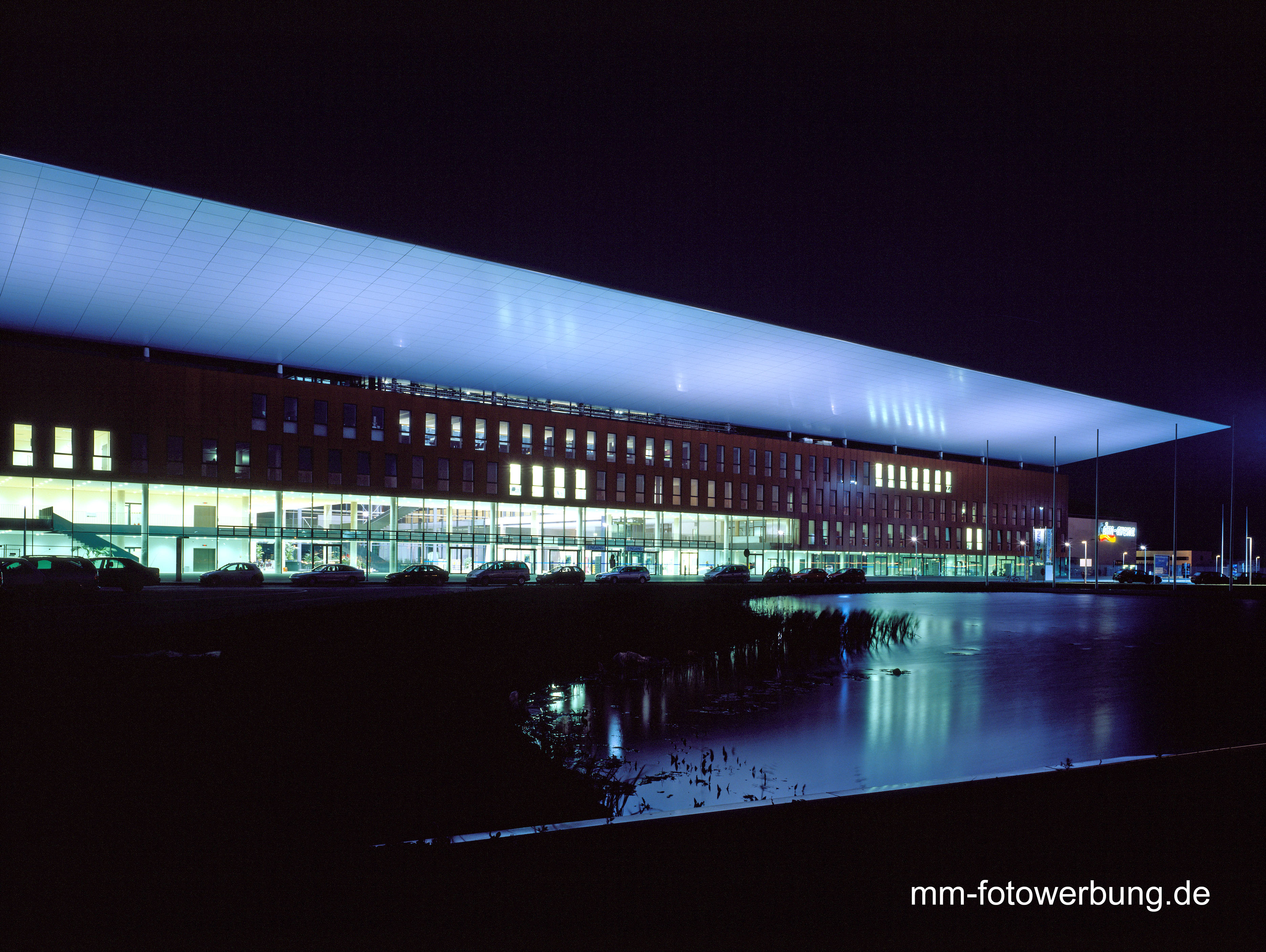 Planflächenstrahler der Franz Sill GmbH in verschiedenen Leistungsstufen beleuchten die Parkplätze, die Zufahrtswege, das große Vordach des Eingangsgebäudes und die Aktionhalle. In den Planflächenstrahlern der Aktionshalle kommen dimmbare Halogen-Glühlampen, wie auch leistungsstarke Halogen-Metalldampflampen zugleich zum Einsatz.
