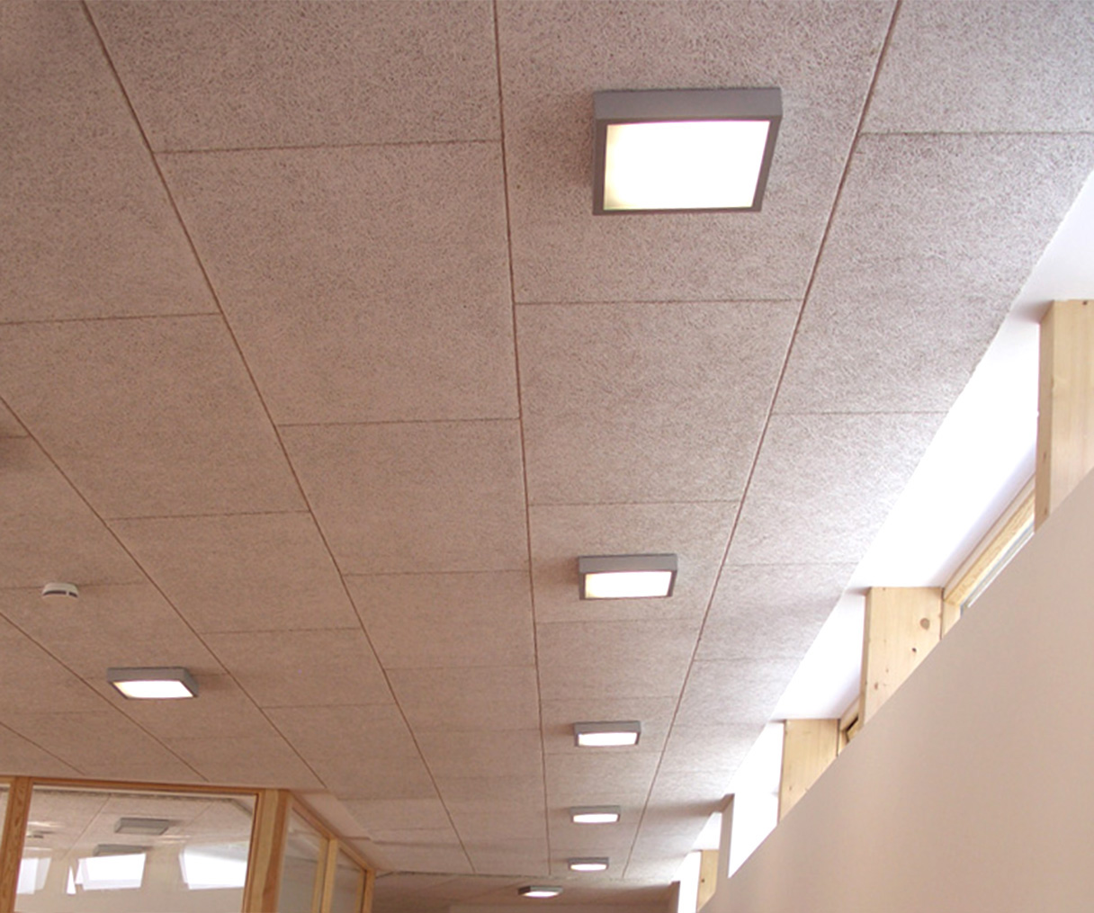Mittels besonders flachen und kompakten Aufbauleuchten werden die Foyer und Flurbereiche beleuchtet. Zum Einsatz kommen die Leuchten des Typs Pianura und Pianezza.