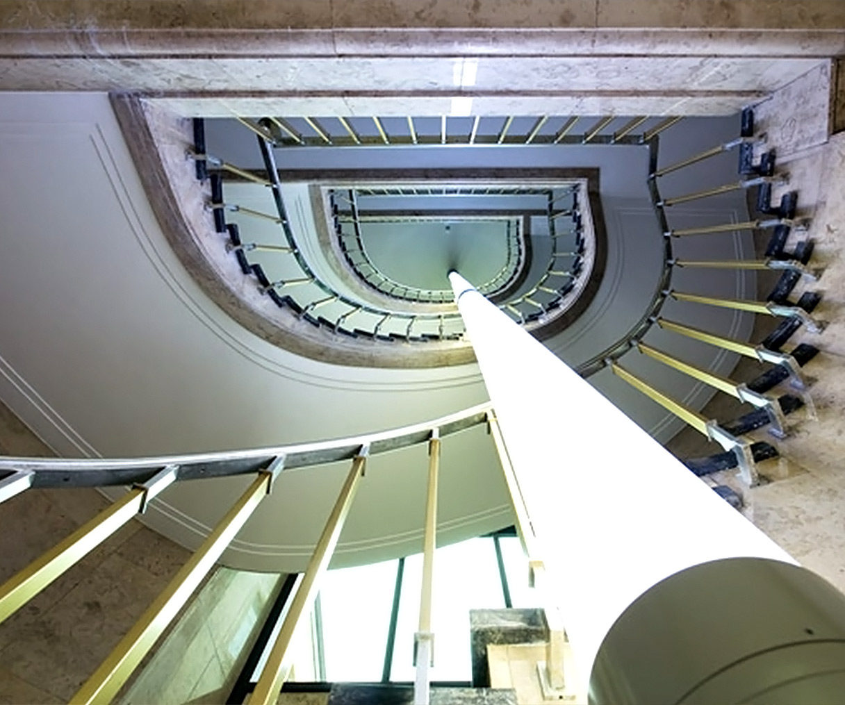 Treppenhausbeleuchtung ohne Verwendung von Wand - oder Deckenleuchten. Objektleuchte im Treppenauge mit lichtleitendem Kunststoffrohr und Leuchtstofflampen, teilweise farbig zur Einhaltung der Corporate Identity.