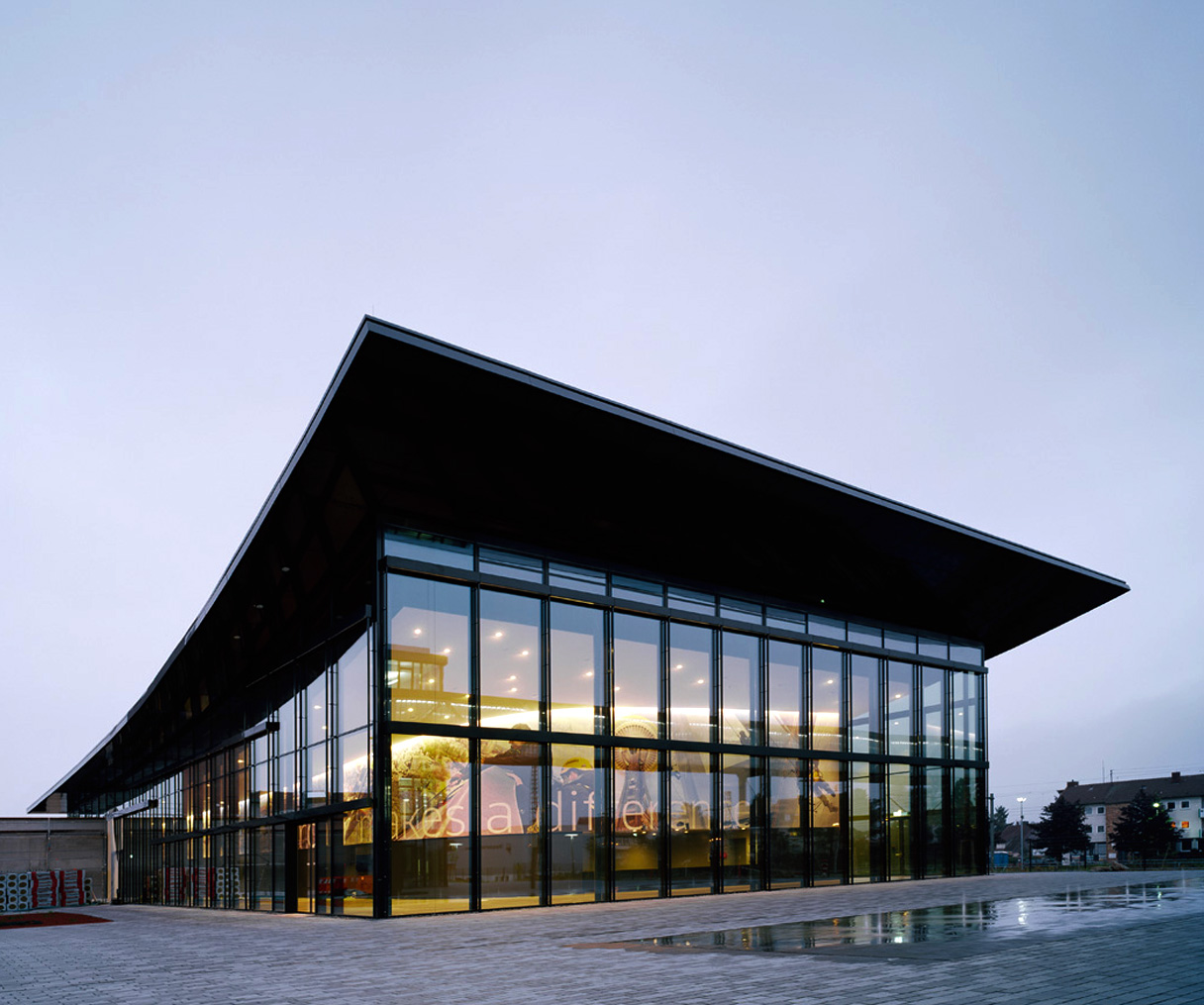 Das zentrale Gebäude der Kärcher Werkserweiterung ist das Auditorium in dem bis zu 800 Personen Platz finden. Multifunktionale Lichtkanäle sorgen für unterschiedliche Lichtstimmungen, je nach Nutzung des Saales. LED Profilleuchten folgen der gerundeten Wand und setzen so die Außenhaut des Saales lichttechnisch in Szene.