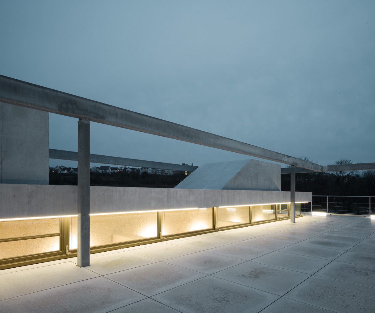 Mit linearen LED Profile in asymmetrische Optik, wurden die Gebäudekerne in Szene gesetzt. Die Büros wurden mit maßgefertigten Schrank- und Pendelleuchten versehen. Eine Spezialität: Für den Glasfaserbeton wurden Leuchten entwickelt, die Nachts das Firmenlogo auf den Beton projizieren.