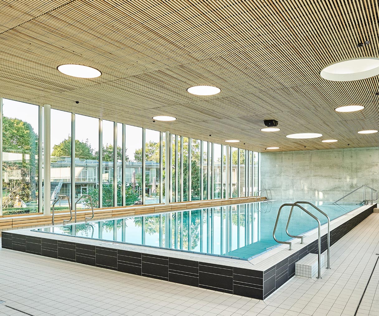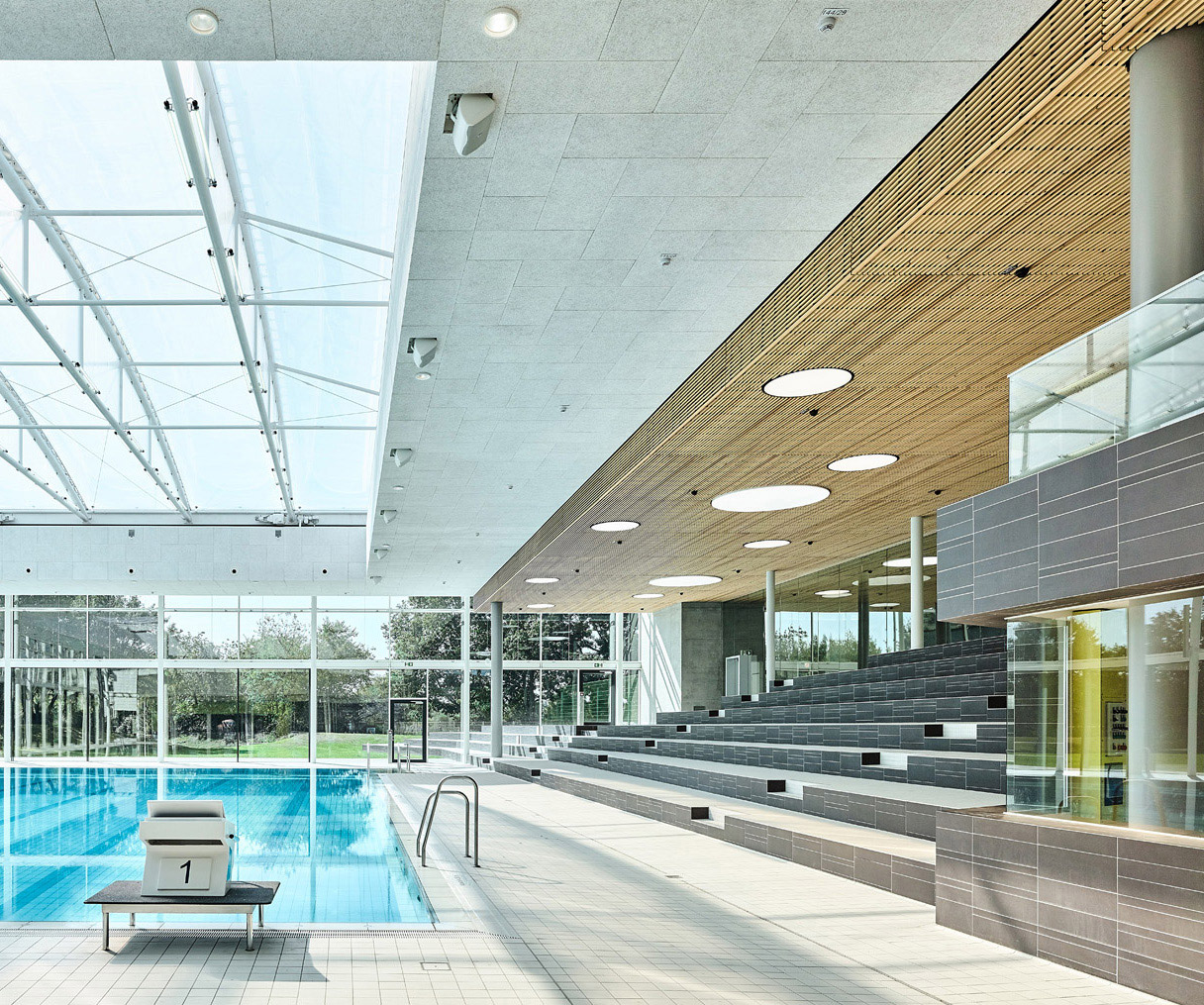 Um die geforderte Beleuchtungsstärke mit einem Designobjekt zu verbinden, wurden große, runde Flächenleuchten durch die lighting architects, Karlsruhe eingesetzt. Diese Leuchten sind mit einer Spezialbeschichtung für chlorhaltige Luft beschichtet.