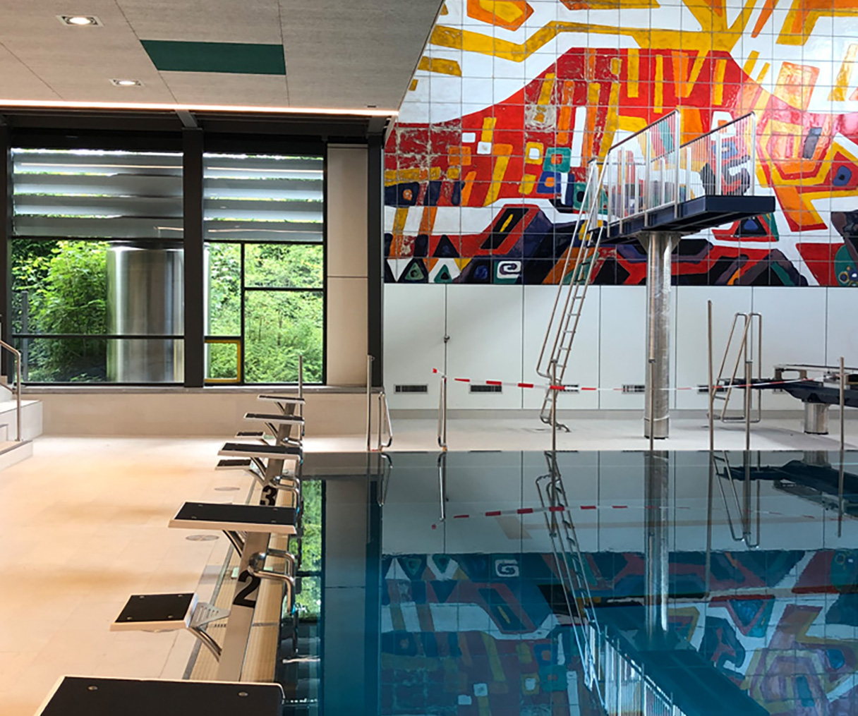 Mit der Sanierung des Bades wurde eine Beleuchtung der Badehalle mit Chlor- und feuchtigkeitsresistente Lichtkanalsysteme realisiert. In den Umkleiden kommen Nautik LED Profilsystemen zum Einsatz, die bis zu 30m mit einer Einspeisung versorgt werden können. Ingenieurbüro Schnell, Stuttgart