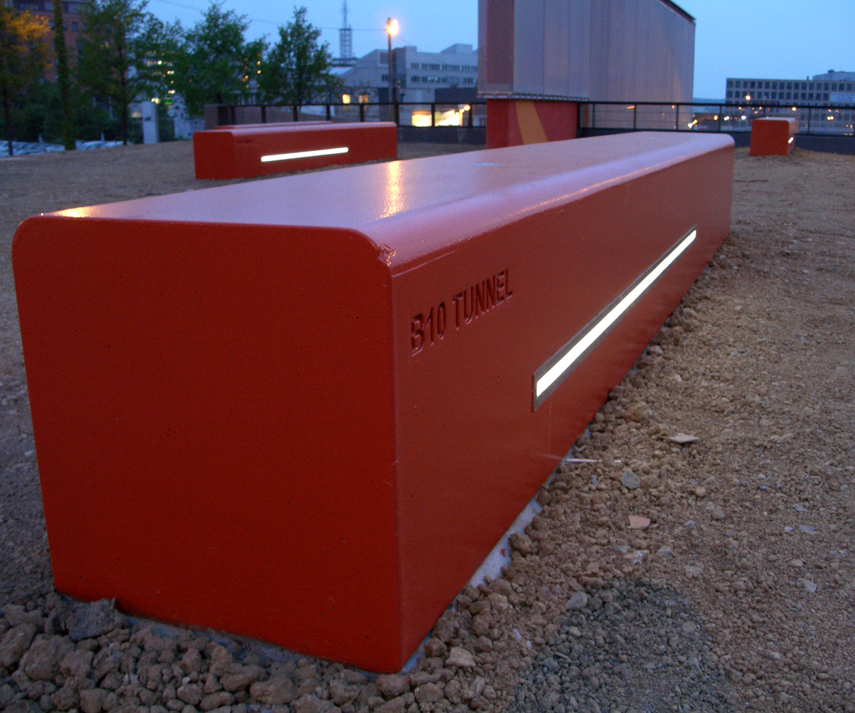 Akzentuierte Beleuchtung der roten Betonbalken mit eingelassenen Lichtkanälen und technische Beleuchtung der Ein- und Ausfahrten des Tunnels.