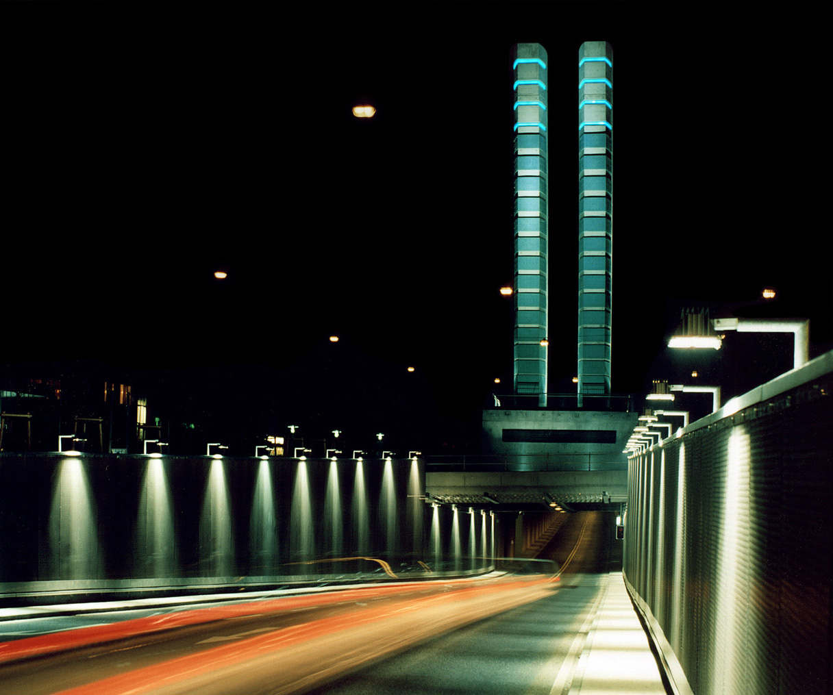 Die Tunnelportale und Zufahrten sind beidseitig mit Sill Kompaktstrahlern der Serie 408 beleuchtet. Das Lüftungsbauwerk ist mit Spangen aus Slimline Leuchtröhren verziert.