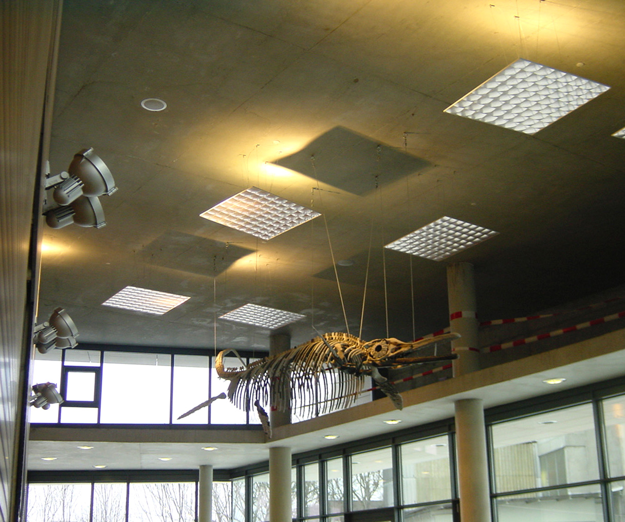 Die dimmbare Saalbeleuchtung wird über Evolventen Leuchten in T5 Leuchtstofftechnik realisiert, die in Deckennischen untergebracht sind. Damit ein durchgehender Lichtstrich entsteht, überlappen die Leuchtmittel innerhalb des asymmetrischen Reflektors. Im Foyer wird ein Abdruck des Fischsauriers mit Spiegel-Werfer-Technik und Strahlern der Serie 021 der Franz Sill GmbH beleuchtet.